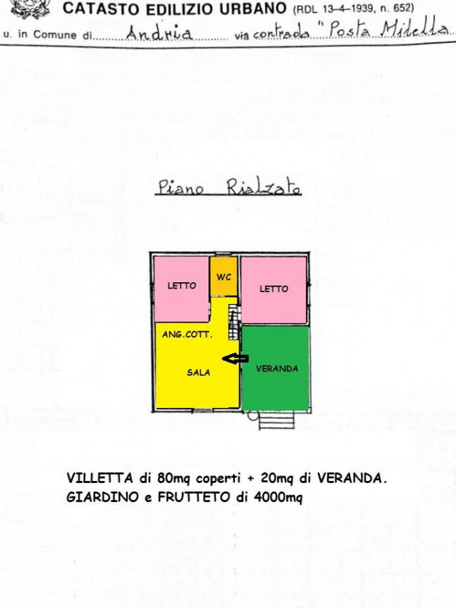 proponiamo Villa singola di 80mq di superficie coperta, Veranda di 20mq e giardino + terreno/frutteto di circa 4000mq.