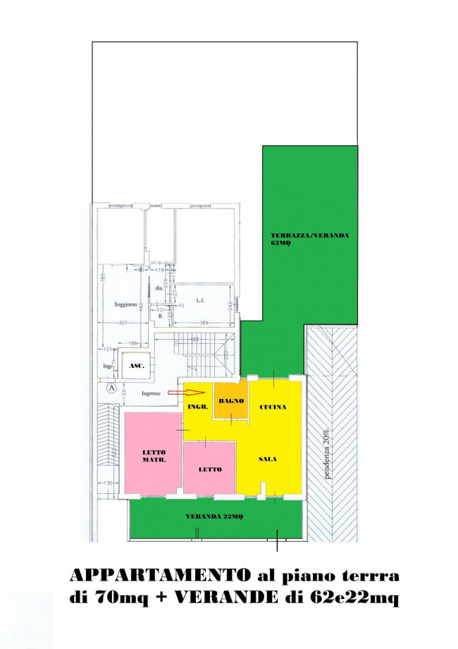 Appartamento (Classe energetica A4) al piano terra di 70mq di superficie coperta, oltre la Verandina anteriore di 22mq e la Veranda/Terrazzo a livello retrostante di 62mq
