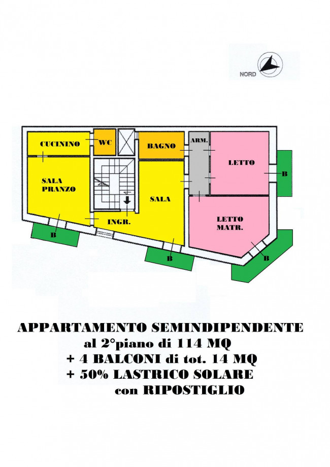 di 114mq di superficie coperta, 4 Balconi per totali 14mq, Lastrico solare al 50% con ampio ripostiglio.