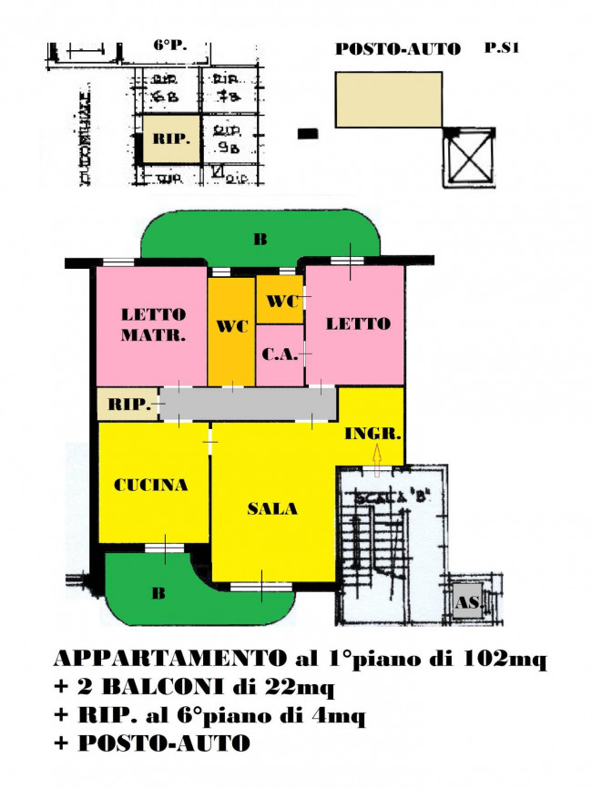 Appartamento sito al 1°piano con doppio affaccio avente una superficie coperta di 102mq, 2 ampi Balconi di tot. 22mq, ripostiglio sul Terrazzo al 6°piano