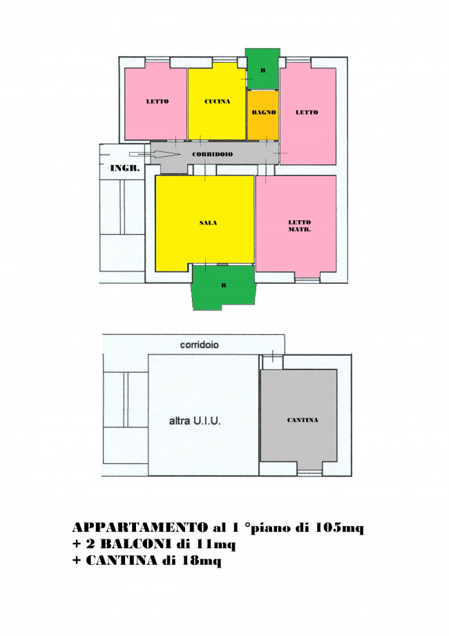 Appartamento circondato dal verde al 1° piano di 105mq di superficie coperta, oltre a 2 Balconi e Cantina di 18mq.